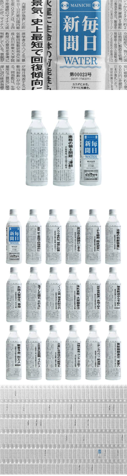日本的每日新聞發(fā)現(xiàn),買(mǎi)報(bào)紙的年輕人數(shù)量不斷降低,而買(mǎi)瓶裝礦泉水的年輕人卻有所增加。于是設(shè)計(jì)師 Yoshinaka Ono為每日新聞設(shè)計(jì)出承載新聞的礦泉水瓶,一個(gè)月內(nèi)將 31 款新聞瓶子成功推入市場(chǎng)。一個(gè)意外收獲是,用報(bào)紙做產(chǎn)品包裝,逼格不僅沒(méi)有降低,而且在貨架上的識(shí)別度也很高。最終在一個(gè)月的時(shí)間里,幾乎每一個(gè)零售超市平均售出3000瓶這樣的News Bottle礦泉水??梢哉f(shuō),《每日新聞》既挽提高了銷量,又將用戶引向了移動(dòng)端,包裝的作用意義非凡。